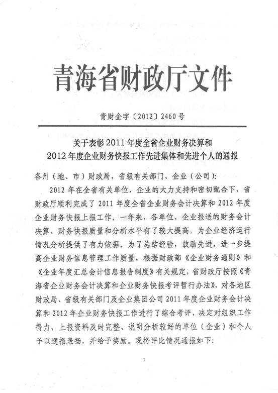 2012年,在集團(tuán)及所屬各公司領(lǐng)導(dǎo)的高度重視下,在所屬各公司的大力支持和密切配合下,在辛勤工作在財(cái)務(wù)會計(jì)崗位上的同事們的共同努力下,集團(tuán)總公司圓滿完成了省國資委和省財(cái)政廳各類報(bào)表的上報(bào)工作,財(cái)務(wù)信息工作質(zhì)量、時效性和財(cái)務(wù)分析水平都比上一年度有所提高,受到了省國資委和省財(cái)政廳的好評,集團(tuán)總公司2011年度財(cái)務(wù)決算工作被省國資委評為先進(jìn)單位,集團(tuán)財(cái)務(wù)審計(jì)部張莉青同志被省財(cái)政廳評為2012年度財(cái)務(wù)快報(bào)工作先進(jìn)個人。